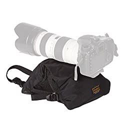 This rugged bean bag is for supporting a DSLR, mirrorless, or video camera on a vehicle, particularly on a safari vehicle, car window, chair, table, tree limb, fence post, or on the ground. It is quicker to use than a tripod in a safari park where you are not allowed to step outside your van. The bag has a zippered compartment—filler, such as polyethylene beads, buckwheat hulls, rice, beans, etc., can be added w/o the need for a liner.