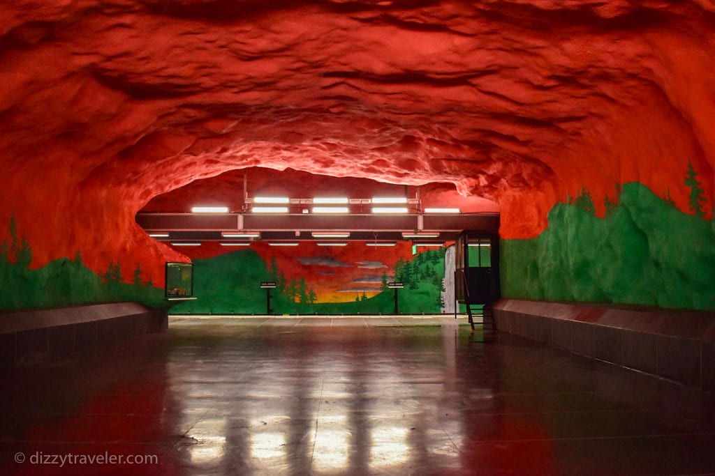 Hopping into the Blue Line, do not miss to get off at Solna Centrum Station for its spellbinding art motif of forest and evening sun. The green and bright red colors of the walls and ceilings depict a feeling that you are walking into the woods on sundown.