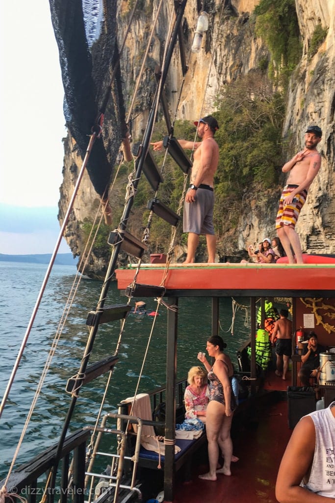 As the sun set, we had a delicious Thai dinner served on the boat. It was the perfect way to end our day after all the swimming and jumping. After dinner, we sailed back to Railay Beach West. But before that, we had another chance to swim near Pranang beach in the dark and see the magical bioluminescent waters.